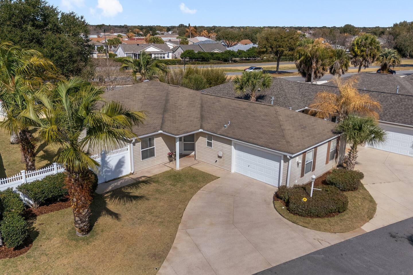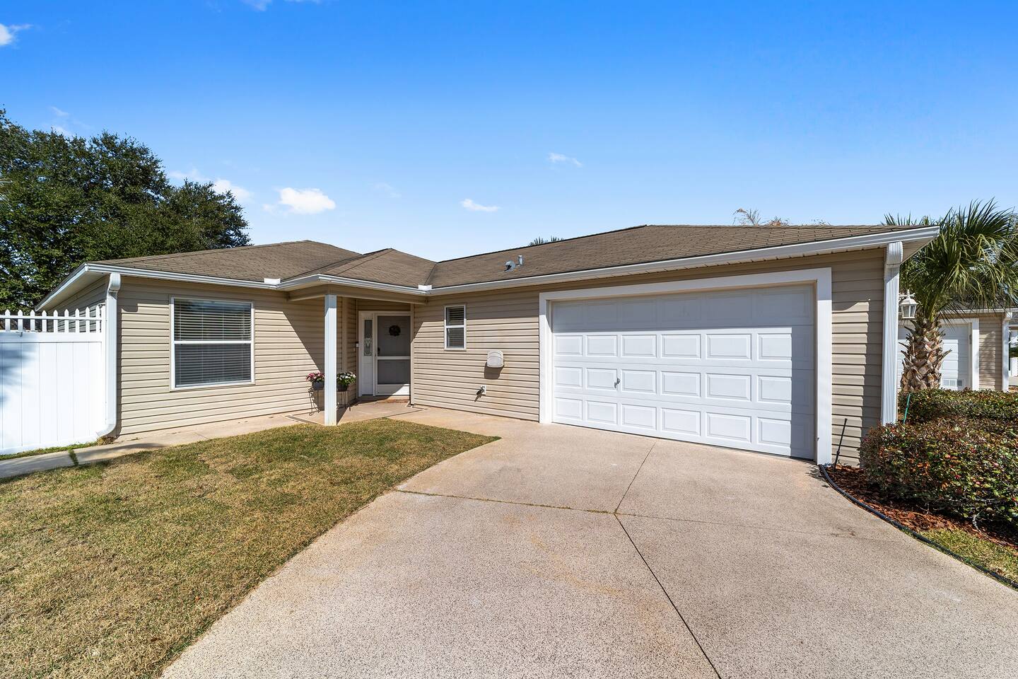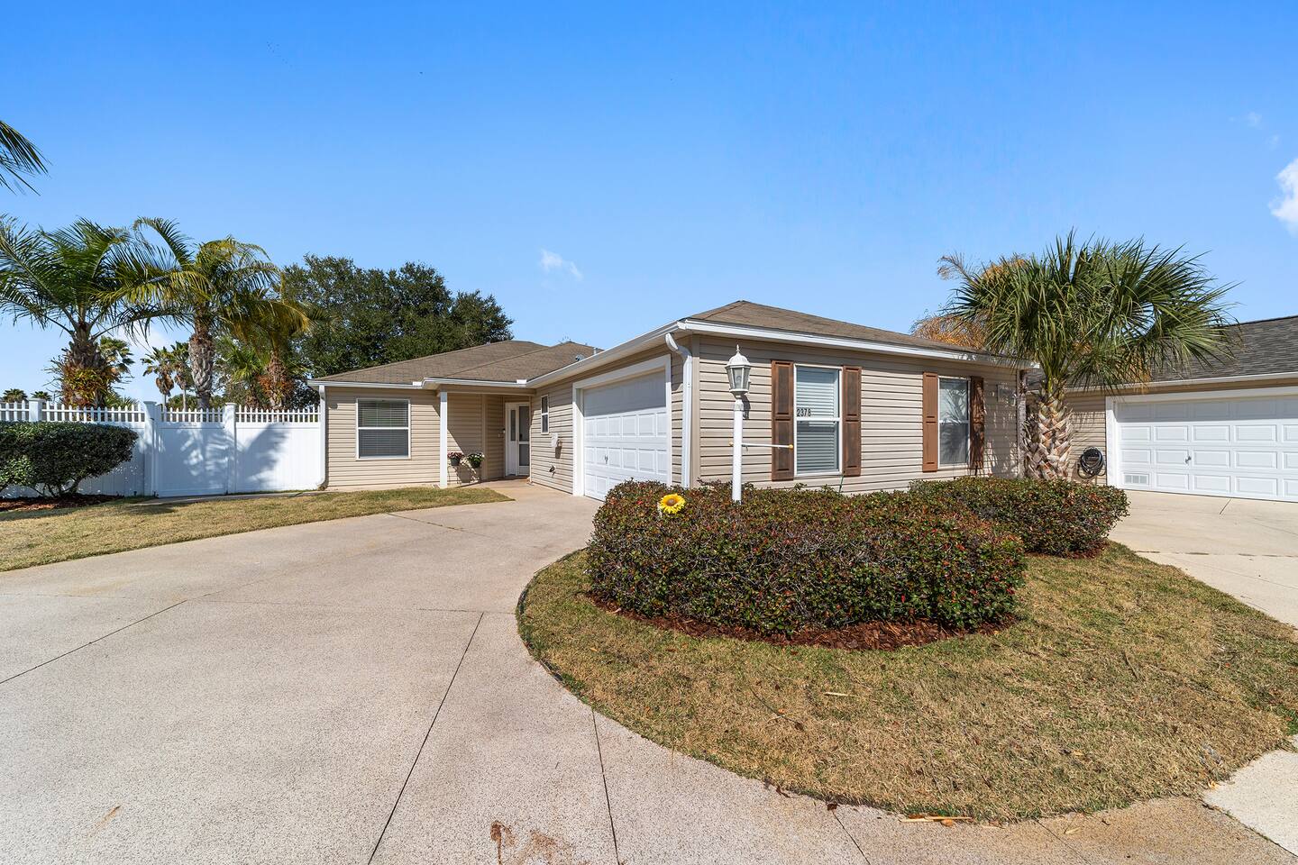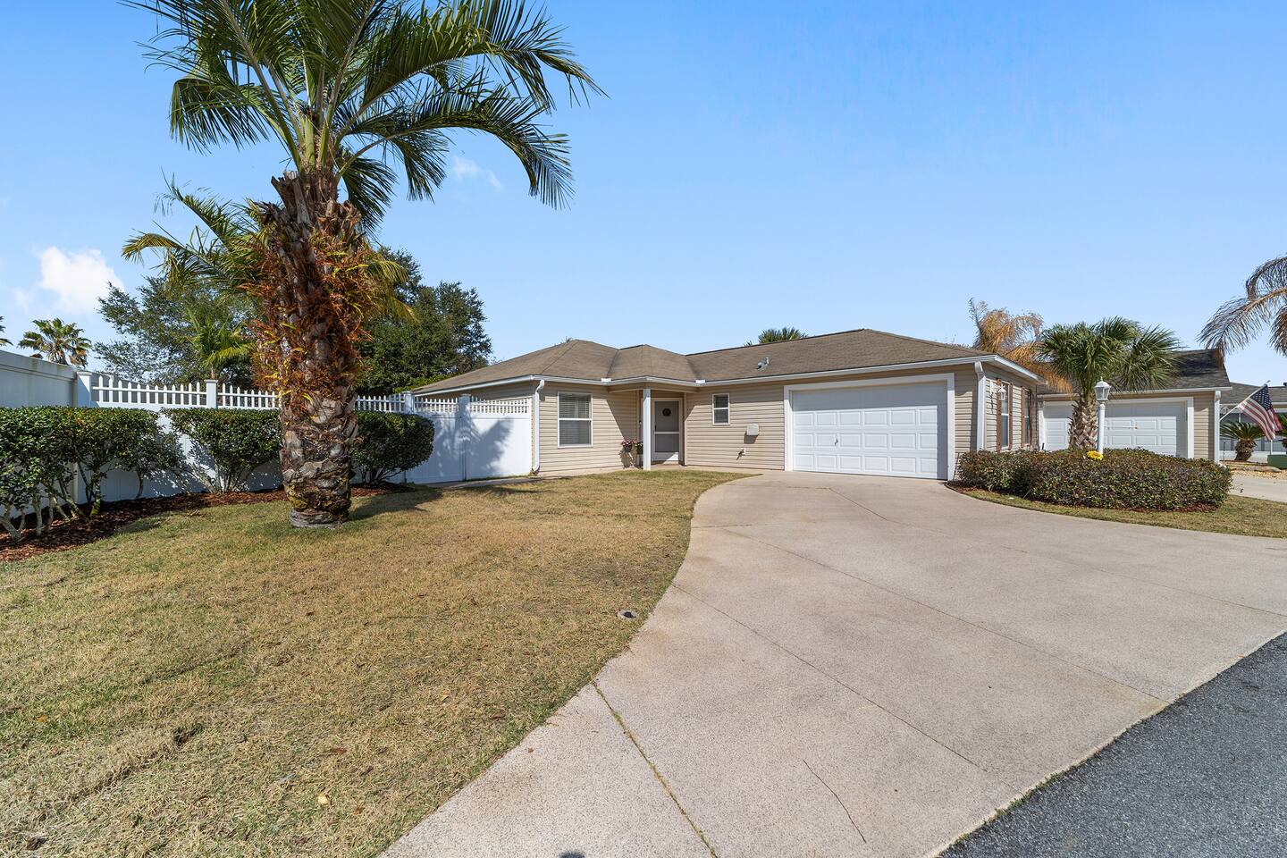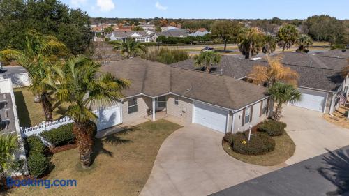 Welcome to your relaxing home base in The Villages, where comfort, convenience, and an active Florida lifestyle come together. This bright and comfortable single-story villa offers what guests are always looking for — location, location, location. Perfectly positioned between Brownwood Paddock Square and Lake Sumter Landing, you’ll have easy access to two of the most popular town squares, known for nightly live music, restaurants, shopping, and entertainment just a short golf cart ride away. The home is also located near the Duval Recreation Area, one of the closest activity centers to the villa. Guests can enjoy shuffleboard, bocce ball, horseshoes, swimming, and social spaces just minutes away. Golf lovers will appreciate being surrounded by hundreds of holes of championship and executive golf, all easily accessible by cart. Inside, the home is designed for comfort and longer stays. The peaceful primary suite features a comfortable bed, TV, private bathroom, and walk-in closet, creating a quiet place to relax after a full day of activities. Two additional bedrooms provide flexible space for visiting friends or family, along with a convenient second full bathroom. The living area offers a welcoming space to unwind, watch your favorite shows, or plan the next day’s outing. A full washer and dryer located in the garage makes extended stays easy and convenient, while the quiet residential setting ensures you’ll feel settled from the moment you arrive. What truly makes this home special is how easily you can enjoy everything The Villages has to offer. Spend mornings golfing or walking nearby paths, afternoons relaxing at pools or recreation centers, and evenings heading to the squares where live music, dancing, dining, and entertainment happen every night of the week. Whether it’s a casual drink, outdoor concert, or waterfront dinner, you’re always close to the action while still having a peaceful place to come home to. Whether you're visiting for golf, a seasonal stay, exploring retirement, or simply enjoying Florida sunshine, this villa offers the perfect combination of comfort, access, and location. Come experience why so many guests return to The Villages year after year — and why this home makes the perfect place to stay.