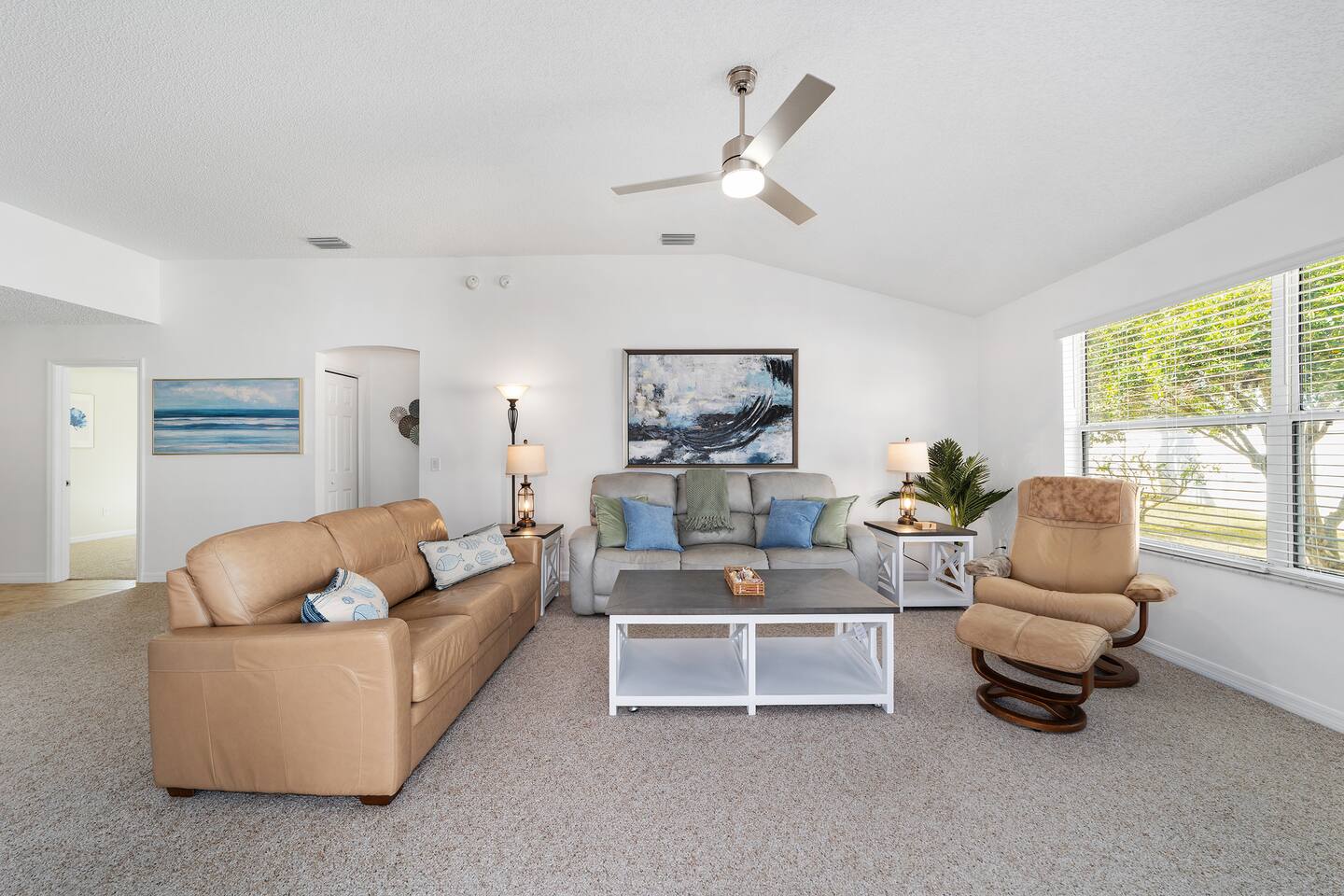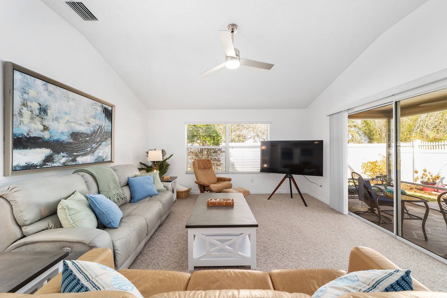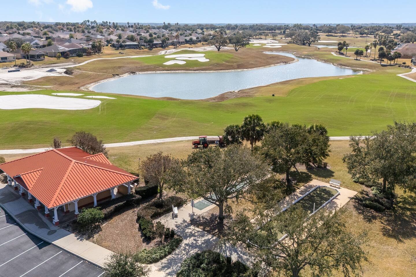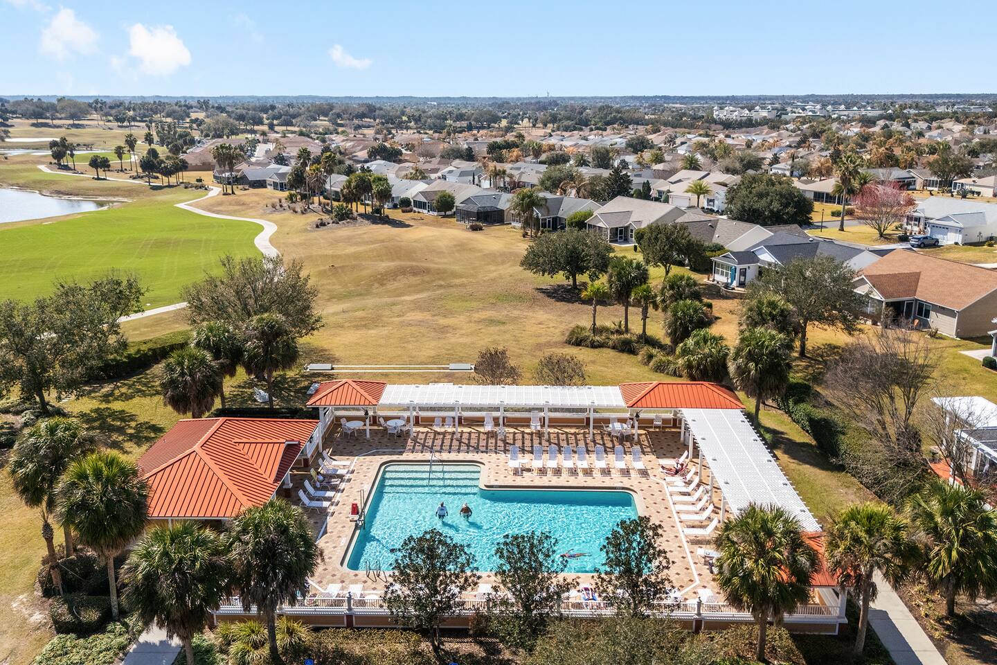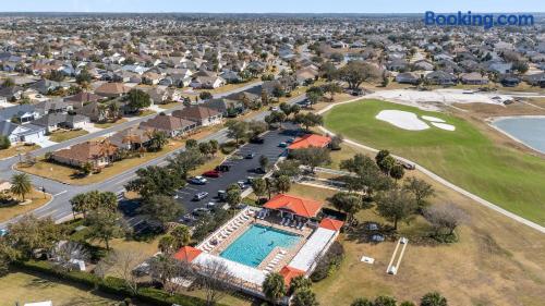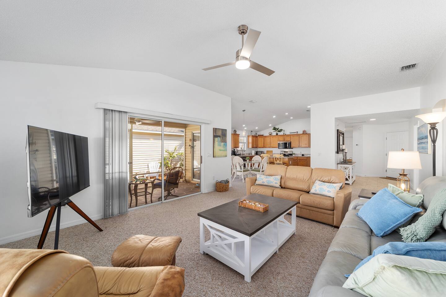 Welcome to your relaxing home base in The Villages, where comfort, convenience, and an active Florida lifestyle come together. This bright and comfortable single-story villa offers what guests are always looking for — location, location, location. Perfectly positioned between Brownwood Paddock Square and Lake Sumter Landing, you’ll have easy access to two of the most popular town squares, known for nightly live music, restaurants, shopping, and entertainment just a short golf cart ride away. The home is also located near the Duval Recreation Area, one of the closest activity centers to the villa. Guests can enjoy shuffleboard, bocce ball, horseshoes, swimming, and social spaces just minutes away. Golf lovers will appreciate being surrounded by hundreds of holes of championship and executive golf, all easily accessible by cart. Inside, the home is designed for comfort and longer stays. The peaceful primary suite features a comfortable bed, TV, private bathroom, and walk-in closet, creating a quiet place to relax after a full day of activities. Two additional bedrooms provide flexible space for visiting friends or family, along with a convenient second full bathroom. The living area offers a welcoming space to unwind, watch your favorite shows, or plan the next day’s outing. A full washer and dryer located in the garage makes extended stays easy and convenient, while the quiet residential setting ensures you’ll feel settled from the moment you arrive. What truly makes this home special is how easily you can enjoy everything The Villages has to offer. Spend mornings golfing or walking nearby paths, afternoons relaxing at pools or recreation centers, and evenings heading to the squares where live music, dancing, dining, and entertainment happen every night of the week. Whether it’s a casual drink, outdoor concert, or waterfront dinner, you’re always close to the action while still having a peaceful place to come home to. Whether you're visiting for golf, a seasonal stay, exploring retirement, or simply enjoying Florida sunshine, this villa offers the perfect combination of comfort, access, and location. Come experience why so many guests return to The Villages year after year — and why this home makes the perfect place to stay.