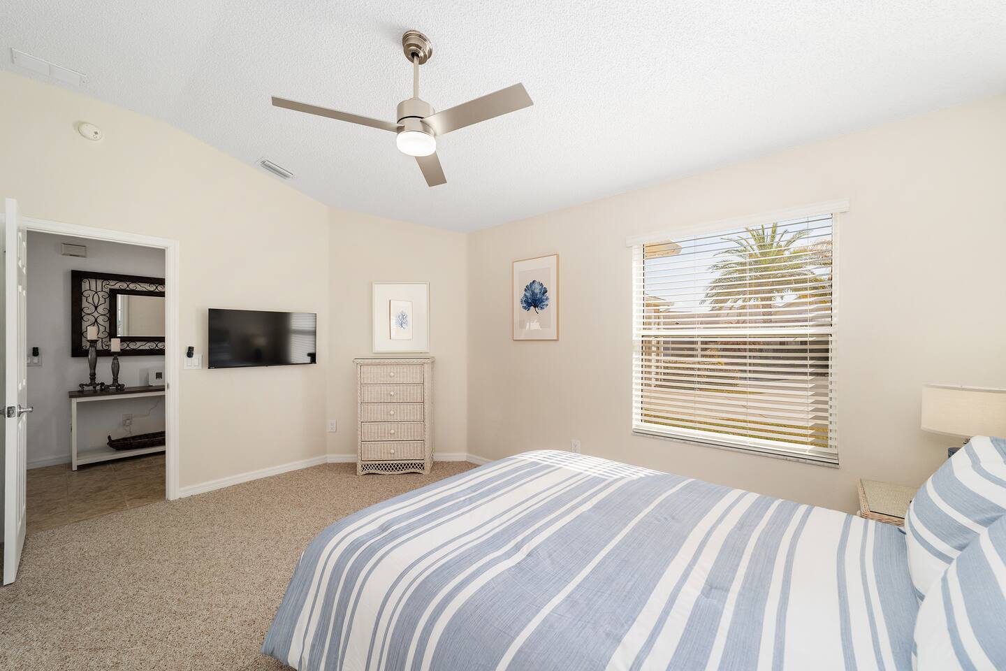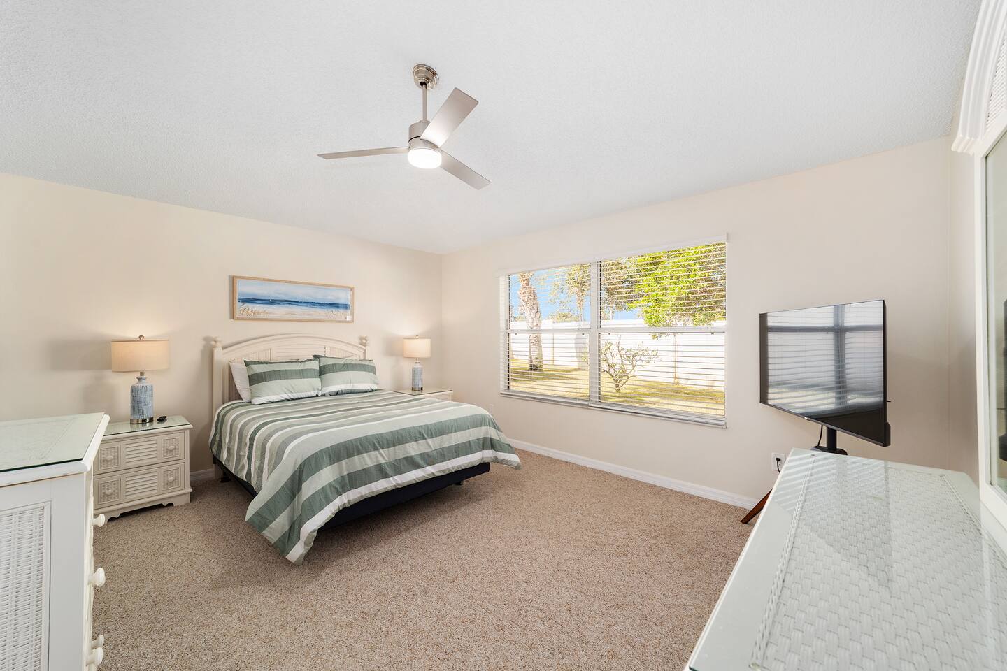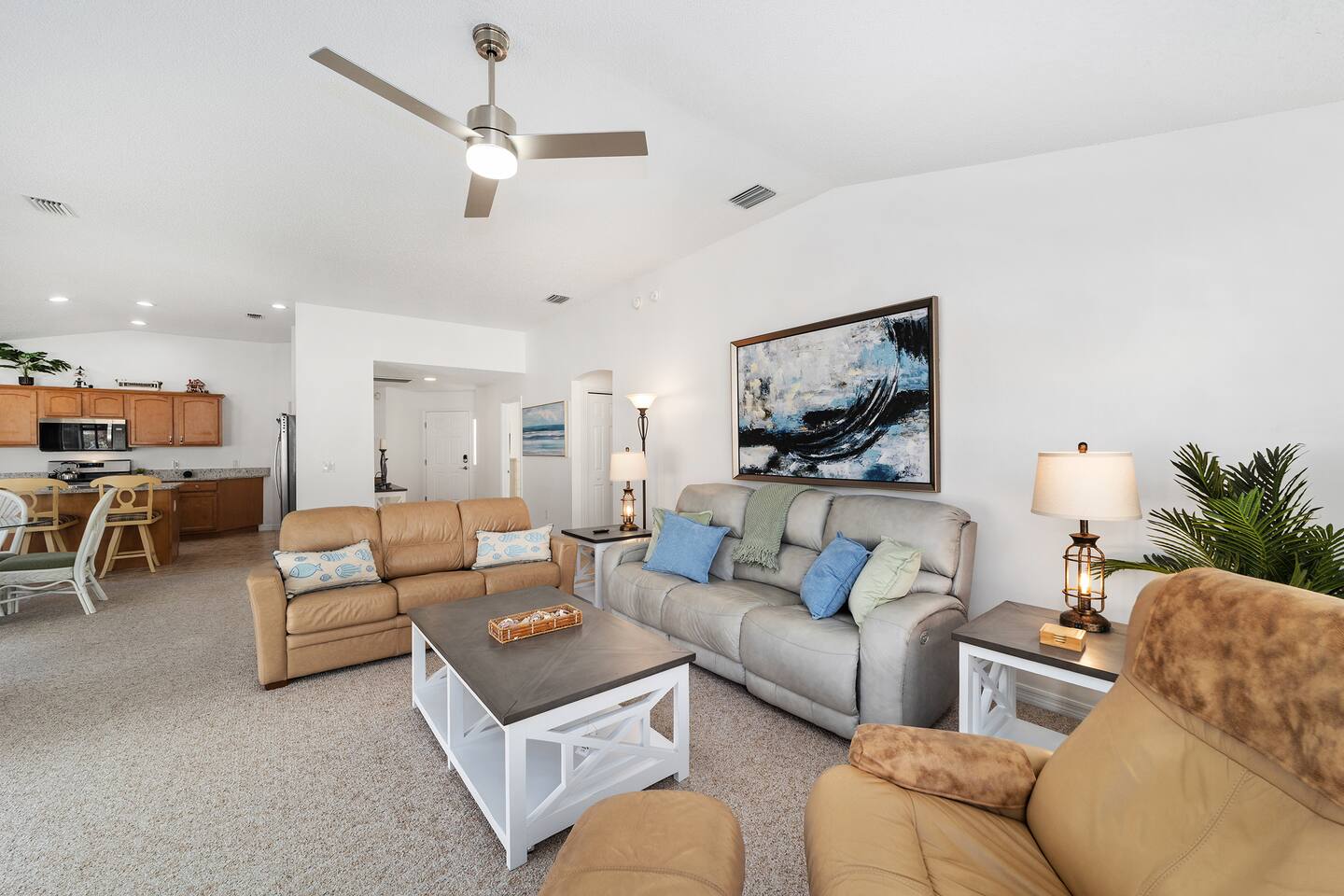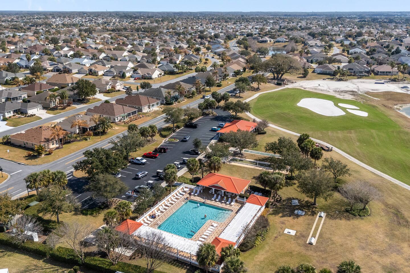 Welcome to your relaxing home base in The Villages, where comfort, convenience, and an active Florida lifestyle come together. This bright and comfortable single-story villa offers what guests are always looking for — location, location, location. Perfectly positioned between Brownwood Paddock Square and Lake Sumter Landing, you’ll have easy access to two of the most popular town squares, known for nightly live music, restaurants, shopping, and entertainment just a short golf cart ride away. The home is also located near the Duval Recreation Area, one of the closest activity centers to the villa. Guests can enjoy shuffleboard, bocce ball, horseshoes, swimming, and social spaces just minutes away. Golf lovers will appreciate being surrounded by hundreds of holes of championship and executive golf, all easily accessible by cart. Inside, the home is designed for comfort and longer stays. The peaceful primary suite features a comfortable bed, TV, private bathroom, and walk-in closet, creating a quiet place to relax after a full day of activities. Two additional bedrooms provide flexible space for visiting friends or family, along with a convenient second full bathroom. The living area offers a welcoming space to unwind, watch your favorite shows, or plan the next day’s outing. A full washer and dryer located in the garage makes extended stays easy and convenient, while the quiet residential setting ensures you’ll feel settled from the moment you arrive. What truly makes this home special is how easily you can enjoy everything The Villages has to offer. Spend mornings golfing or walking nearby paths, afternoons relaxing at pools or recreation centers, and evenings heading to the squares where live music, dancing, dining, and entertainment happen every night of the week. Whether it’s a casual drink, outdoor concert, or waterfront dinner, you’re always close to the action while still having a peaceful place to come home to. Whether you're visiting for golf, a seasonal stay, exploring retirement, or simply enjoying Florida sunshine, this villa offers the perfect combination of comfort, access, and location. Come experience why so many guests return to The Villages year after year — and why this home makes the perfect place to stay.