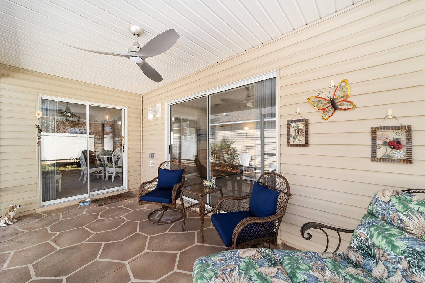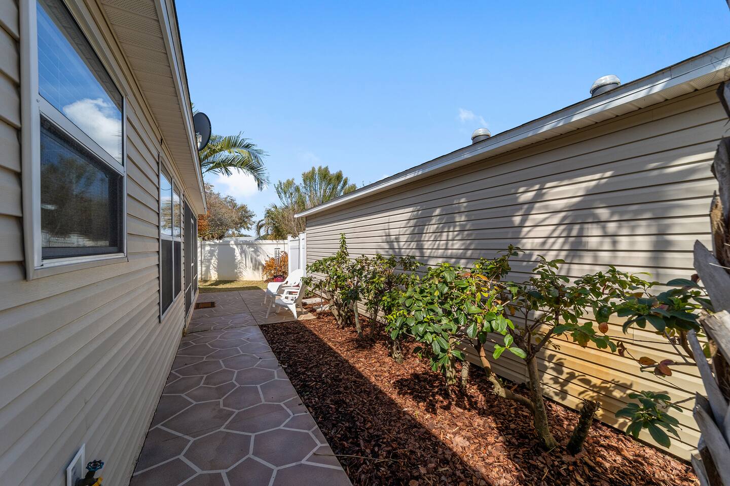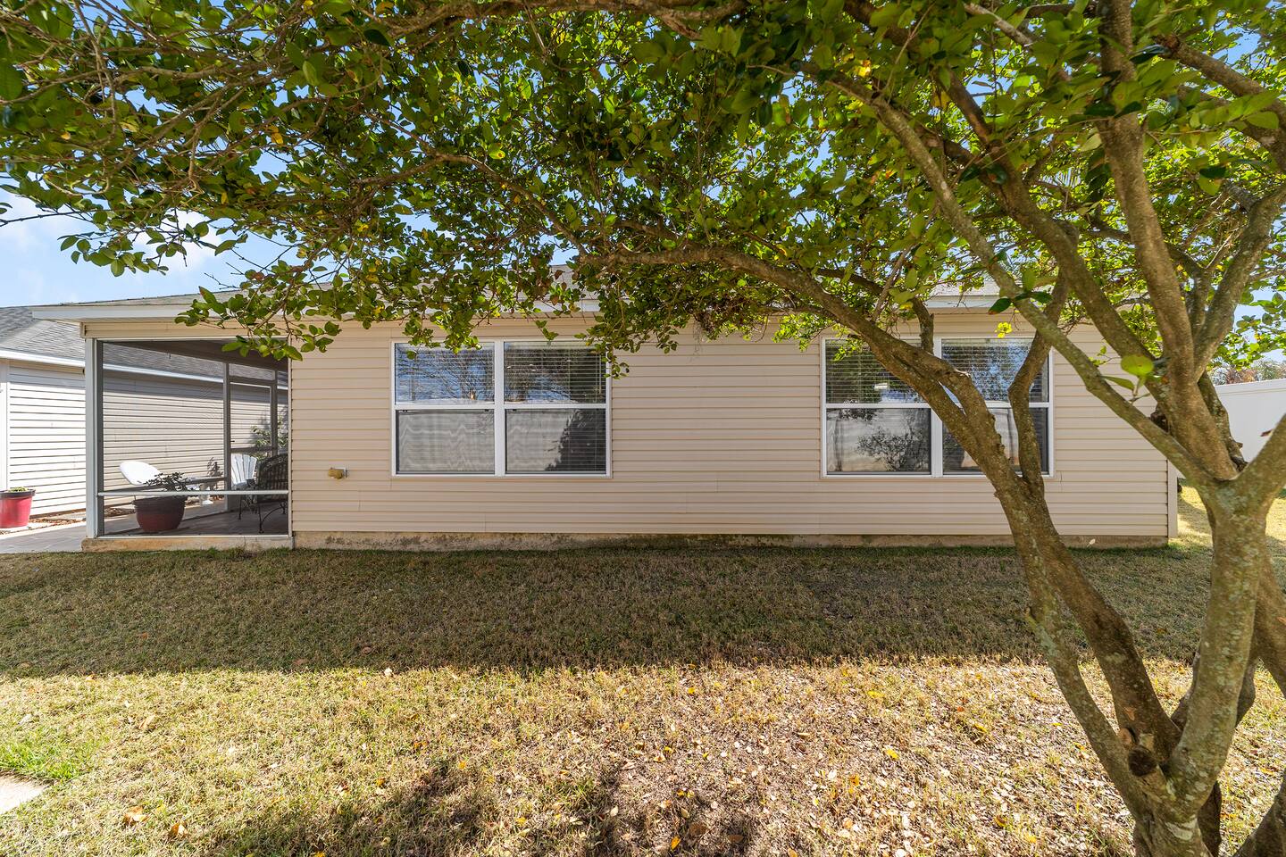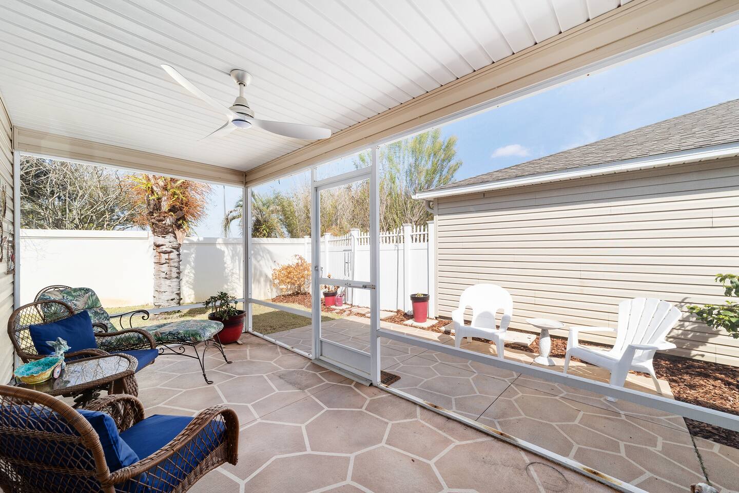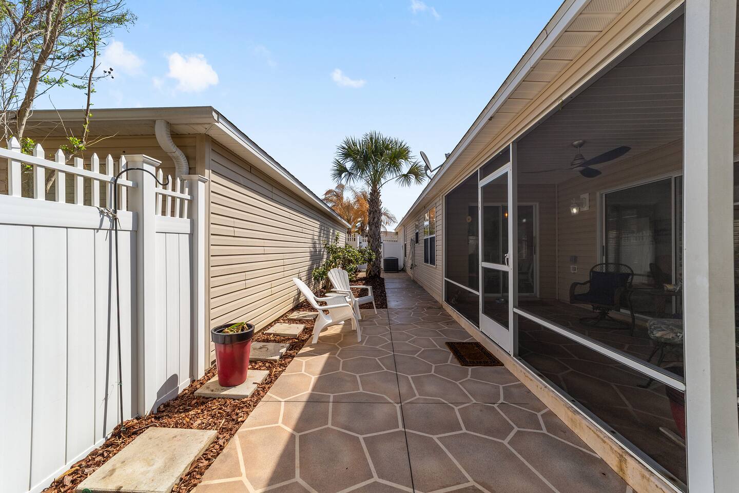 Location, Location, Location! This beautifully furnished courtyard villa is perfectly positioned between Lake Sumter Landing and Brownwood Paddock Square, giving you quick access to the very best of The Villages. Enjoy a bright, spacious layout, a private fenced backyard, and a peaceful setting just minutes from golf, recreation centers, dining, shopping, and nightly live entertainment. After a full day exploring, unwind in the quiet courtyard and enjoy your perfect Florida getaway.